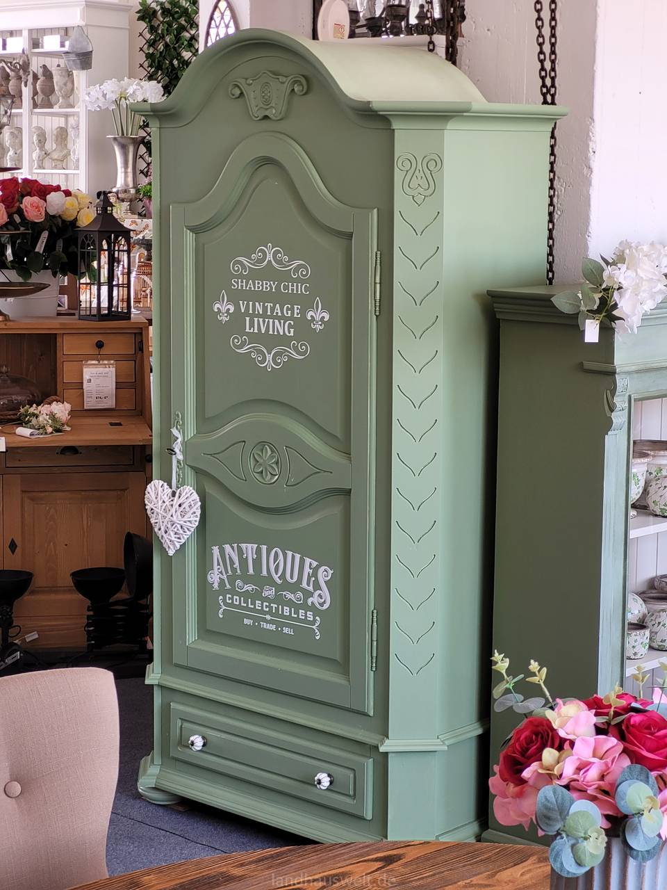 Und schon wieder ist ein alter Kleiderschrank in unserem Atelier zu einem Unikat geworden. Wieder ist es ein eintüriger Schrank. Und wieder haben wir ihm das beliebte Trend-Grün verliehen. Auffällige Applikationen in Weiß geben ihm eine zusätzliche nostalgische Ausstrahlung.