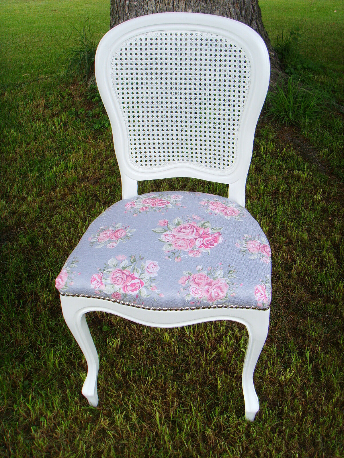 Ein einzigartiges Unikat: Aus einem Retro-Stuhl der 50er- oder 60er-Jahre wurde ein absoluter Hingucker gezaubert. Der Stuhl wurde neu lackiert und die Polsterung neu aufgearbeitet. Der neue Bezug ist ein robuster Profi-Polsterstoff aus unserem Stoff-Sortiment: Polsterstoff in Leinenoptik, hellgrau mit Rosenmuster, geeignet für starke Beanspruchung im Privathaushalt. Damit gibt dieser Stuhl jeder Einrichtung eine besondere nostalgische Note oder einen entsprechend besonderen Kontrast.