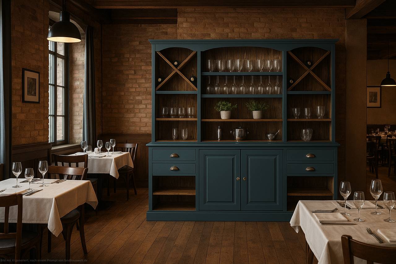 Wenn Nostalgie, Pragmatismus und traditionelles Schreinerhandwerk zusammenkommen, dann einsteht ein solches Möbel. Wir alle kennen es als Tresen-Rückschrank aus der traditionsbewussten Gastronomie. Die Ausführung im Landhaus-Stil greift den aktuellen Trend auf und führt damit die klassische Möbel-Architektur und einen der beliebtesten Einrichtungs-Stile des beginnenden 21. Jahrhunderts zusammen. Ausgeführt in Massivholz-Bauweise wird dieses Möbel darüber hinaus viele, viele Jahre zeitlos bleiben.