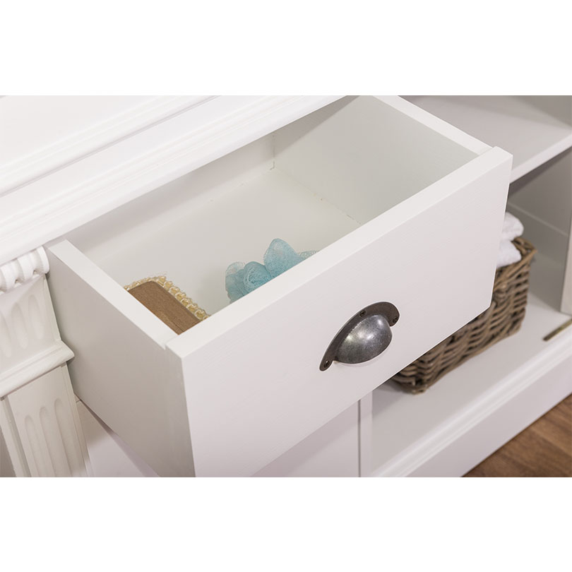Ein Bad im viktorianischen Stil der englischen Landhäuser und Grand Hotels – das ist jetzt preisgünstig möglich mit den Waschtischen dieser Möbelserie. Dieser Waschtisch ist die zeitgenössische Interpretation des viktorianischen Waschtischs. Seine imposante Erscheinung wird durch gerade Linien bestimmt. Der markante Sockel, die typischen Zierornamente und die Kassettierungen von Türen und Seiten machen ihn unverwechselbar.