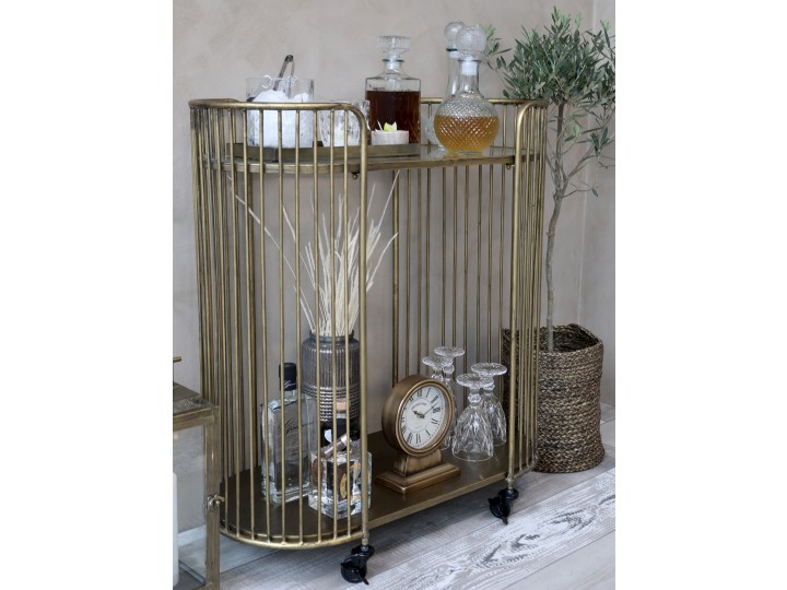 Praktisch und schick, so könnte man diesen tollen Servierwagen beschreiben. 2 Ablageflächen aus Glas und Metall werden von einem messingfarbenen Metallgestell umrahmt. Rollen an der Unterseite des Wagens erleichtern das Verschieben im Raum.