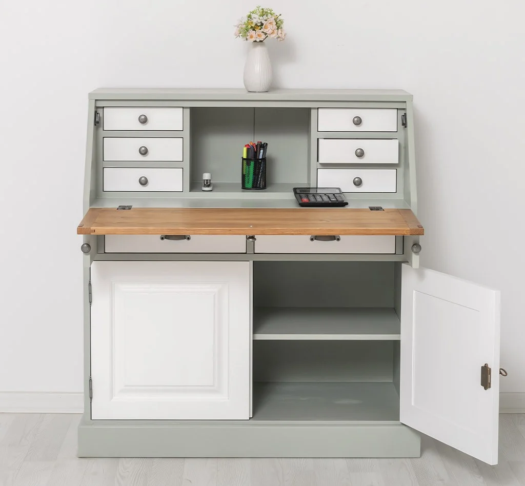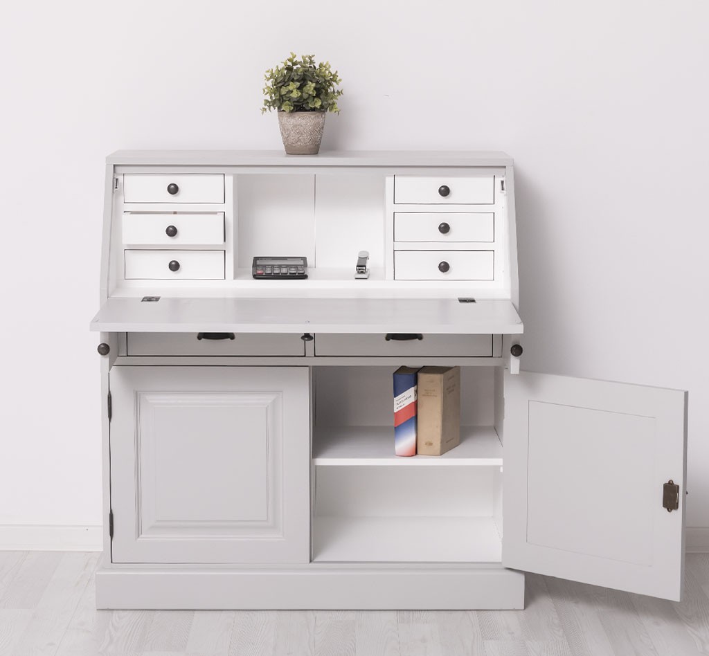 Dieser Sekretär ist ein klassischer Klappsekretär im „Normal-Format“. Er hat 2 Türen (dahinter 1 Regalboden), darüber 2 Schübe, darüber die typische Klappe. Aufgeklappt dient sie als Schreibtisch-Fläche. Zwei Auszüge links und rechts stützen sie dabei. Im aufgeklappten Zustand hat man Zugriff aus jeweils 3 Schübe links und rechts. Dazwischen befindet sich ein Fach, das z.B. ein Notebook aufnimmt. Wie alle unsere Landhausmöbel dieser Serie hat auch dieses Möbel eine Rückwand aus Massivholz. Unsere Landhausmöbel dieser Serie sind auch von innen lackiert oder gewachst, inklusive der Schübe, die ebenfalls vollständig aus gezinkt verarbeitetem Massivholz bestehen.