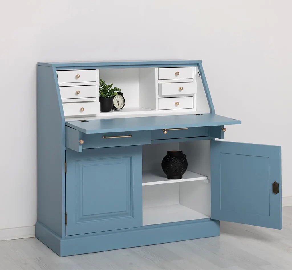 Die Schübe hinter der Klappe sind standardmäßig mit dem Möbelknopf Button-01-23 wie in den Artikelfotos ausgestattet. Alternativ kann dieser Knopf ohne Aufpreis in einer anderen Farbe bestellt werden oder stattdessen ein Holzknopf. (Bei Bestellung mit Holzknopf zu einem mehrfarbigen Möbel geben Sie bitte an, ob der Knopf in der Außenfarbe oder der Innenfarbe lackiert werden soll.) Die beiden großen Schübe sind standardmäßig mit dem Muschelgriff FS3-50 wie in den Artikelfotos ausgestattet. Wenn ein anderer Beschlag gewünscht wird: bitte bei der Bestellung angeben. Die Änderung der Beschläge gegen ein anderes Modell aus unserem Katalog ist kostenfrei.