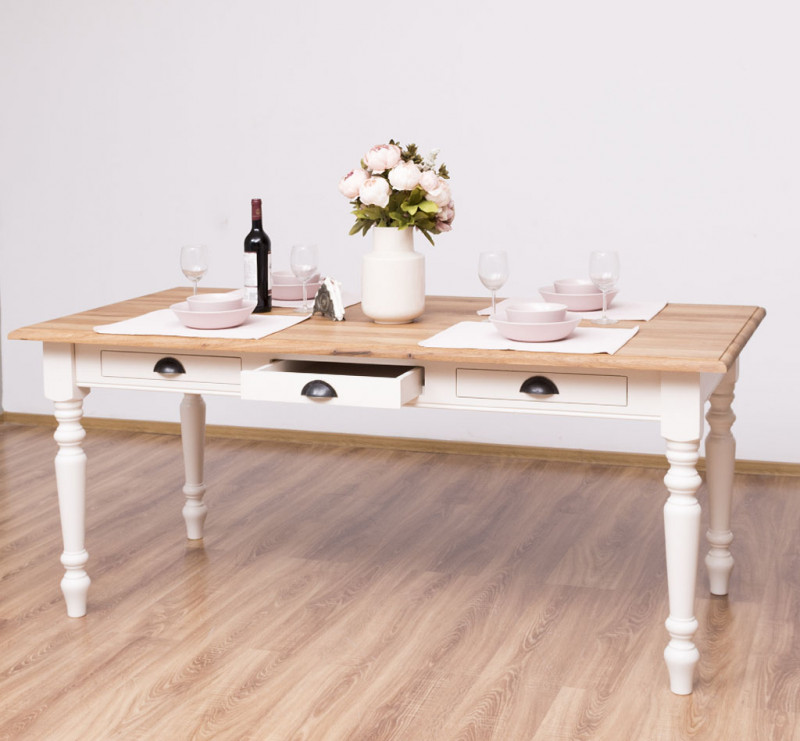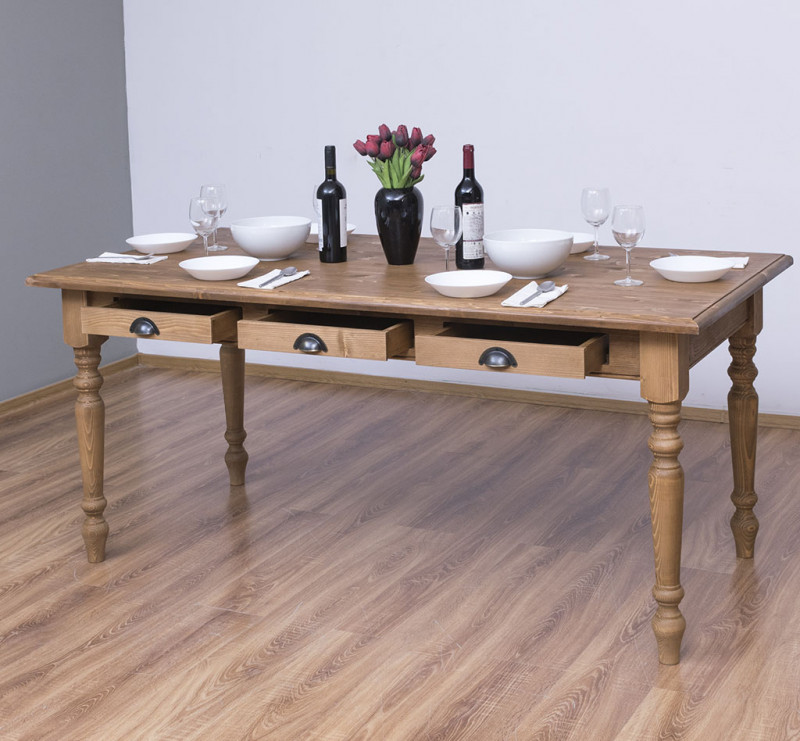 Esstisch im antiken Landhaus-Stil mit rechteckiger Tischplatte 210 x 90 cm, mit gedrechselten Beinen und Schubladen.