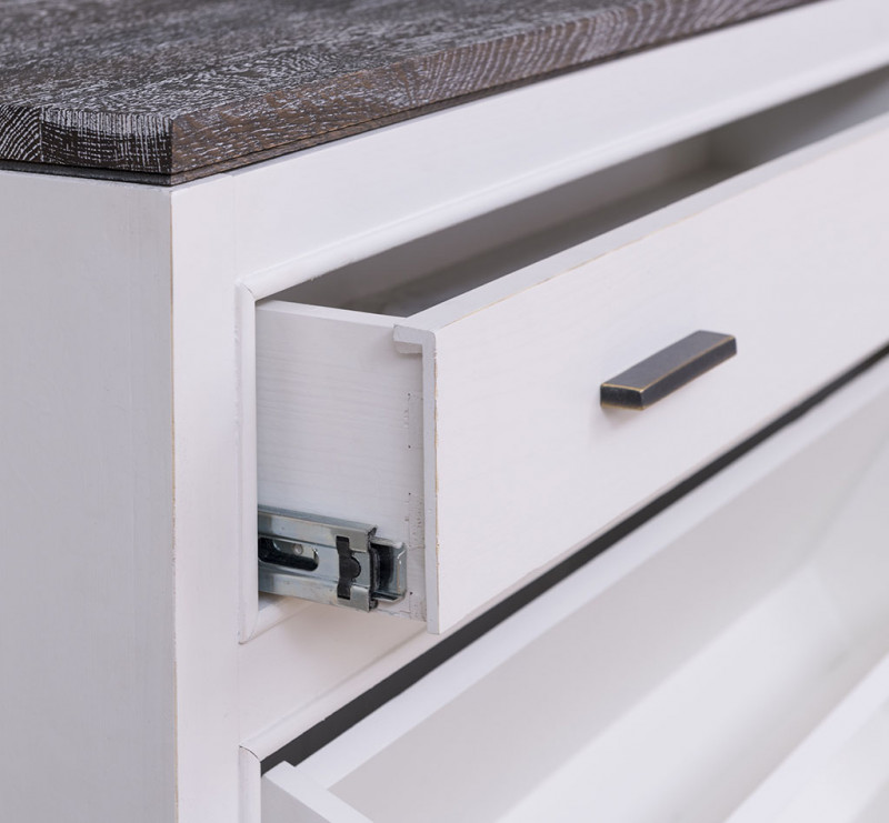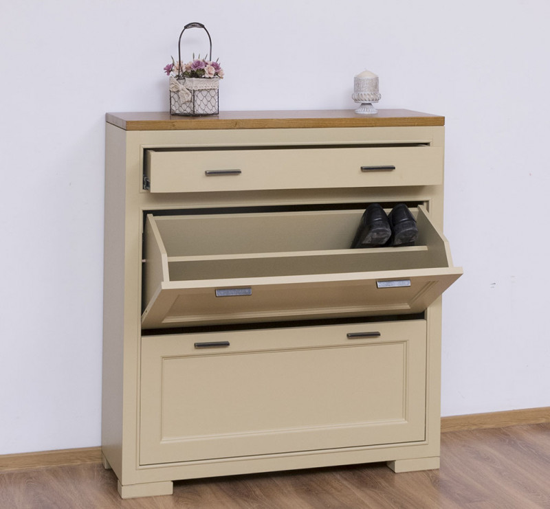 Dieser Schuhschrank ist ein Modell mit der Höhe 110 cm. Diese Möbel verbinden den traditionellen Landhaus-Stil mit einem besonderen Design-Akzent.