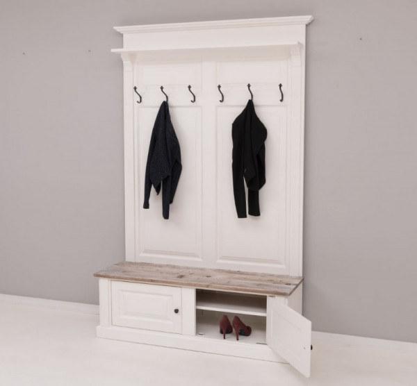 Dies ist eine Wandgarderobe für den großen Flur und den großzügigen Eingangsbereich im nostalgischen Ambiente. Die Garderobe besteht aus einem offenen Garderobenaufsatz auf einem Unterschrank. Die beiden Elemente sind dabei nicht getrennt voneinander, sondern bilden eine konstruktive Einheit. Der Unterschrank hat zwei breite Türen, die Kleiderwand bietet sechs Garderobenhaken. Darüber befindet sich ein separates Fach, das typischerweise als Hutablage dient.