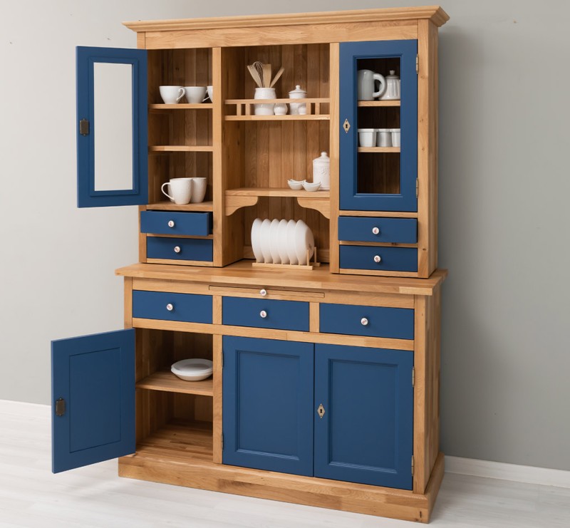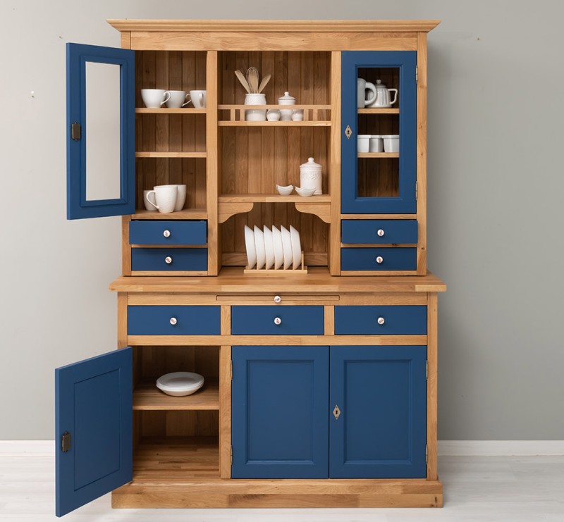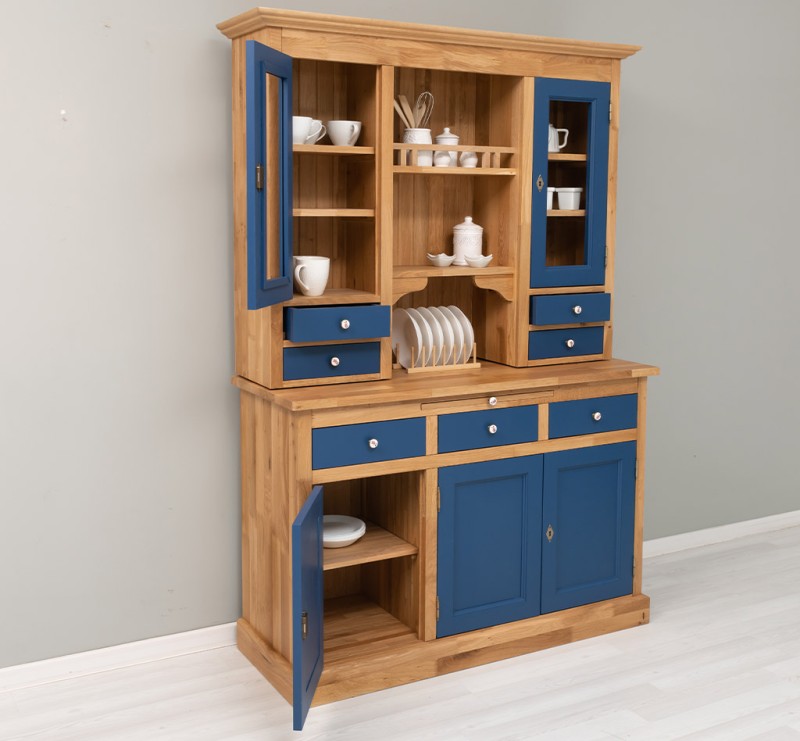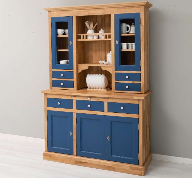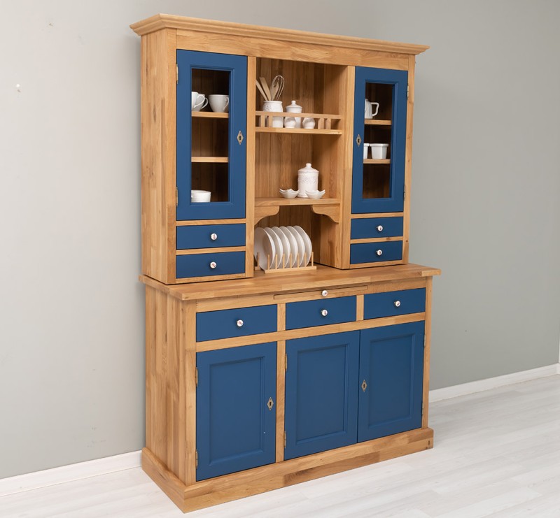 Der Korpus zeigt sich in natürlichem Klarlack, der die warme Maserung des Holzes hervorhebt, während Türen und Schubladen in einem eleganten Violettblau lackiert sind. Diese zweifarbige Kombination verleiht dem Möbelstück eine besondere Tiefe und macht es zum Blickfang in jeder Küche oder im Esszimmer.
