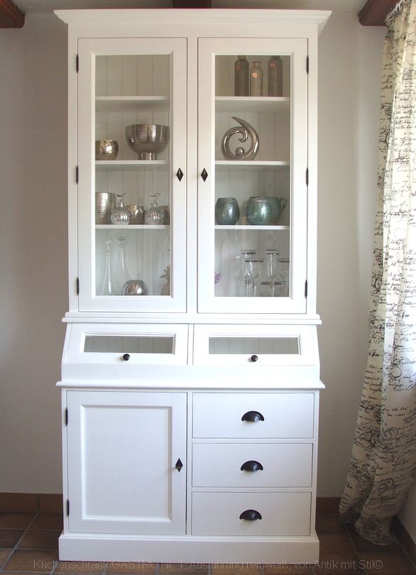 Dieser Küchenschrank aus unserer GASTRO-Serie besteht aus einem Vitrinenaufsatz auf einem besonderen Unterschrank. Das herausragende Merkmal sind die nach oben öffnenden Klappfächer im oberen Bereich des Unterschranks. Historisch sind diese Klappfächer in Norddeutschland und England traditionell bekannt. In den Möbeln der historischen Hanse-Kontors finden sich diese Klappfächer genauso wie in der Seefahrt. Maritim werden diese Fächer in der Einrichtung von Schiffen auch als Schapp bezeichnet. Verbreitung in ganz Europa fanden solche Möbel insbesondere in den Küchen und Speisezimmern des Adels und der „neureichen“ Händler und Industriellen des 19. Jahrhunderts. Vermutlich von dort aus gelangten sie dann in die traditionellen Hotels und Pensionen. Vielleicht ist es auch umgekehrt gewesen, das ist nicht bekannt. Fest steht jedenfalls, dass die Klappfächer ungemein praktisch sind, da sie durch das Glasfenster den Blick auf den Inhalt des Fachs ermöglichen.