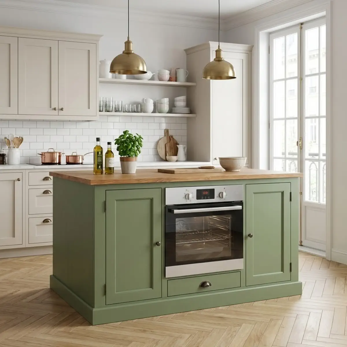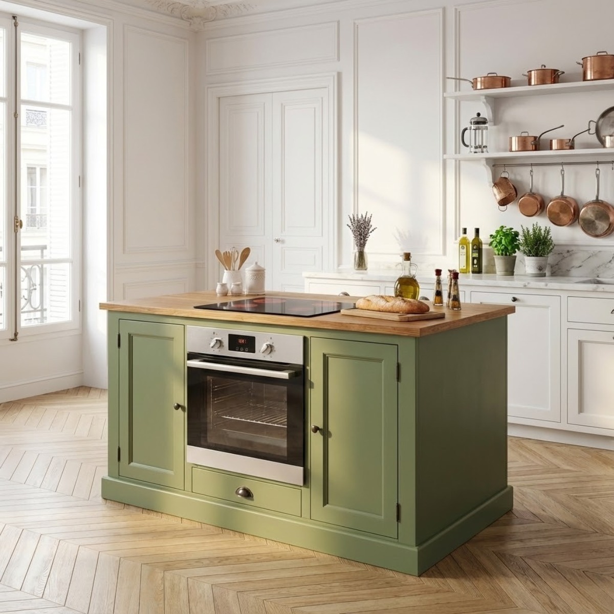 Diese Kücheninsel ist für den teilintegrierten Einbau von Backöfen 60 cm geeignet. Wie bei „echten“ Landhausküchen üblich liegt dabei die Backofenfront auf der Möbelfront auf. Damit ist dieser Unterschrank geeignet für die besonderen Modelle im „alten“ und im Retro-Stil. Natürlich können auch Standard-Geräte eingebaut werden. Tür und Bedienfeld liegen dabei auf der Front auf.
