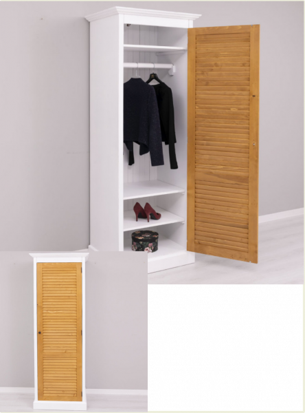 Schrank in Landhaus-Ausführung mit umlaufendem Fußsockel und profiliertem Kranz, Tür mit Lamellen-Front, 3 Einlegeböden und Kleiderstange aus Massivholz