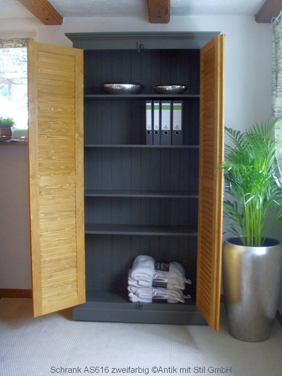 Anders als die Vitrinenschränke findet dieser Lamellenschrank seinen Einsatz eher im Schlafzimmer. In Häusern mit hohen Decken dient er im Bad als stattlicher Badschrank. Und mit der Gesamttiefe von 40 cm passen hinter die Türen auch handelsübliche Aktenordner auf die Einlegeböden. Somit ist dieser Schrank ein wahres Allround-Möbel.