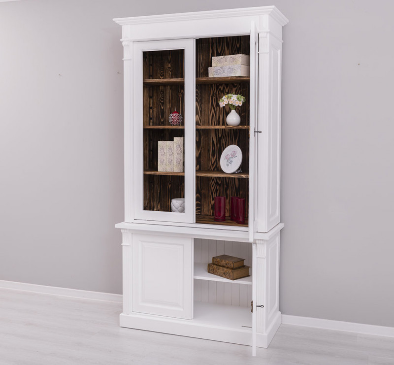 Dieser Schrank ist eine Kombination aus zwei Möbelteilen unserer CLASSIC-Serie im Gründerzeitstil. Diese umfasst verschiedene Ober- und Unterschränke, die sich in Gestaltung und Abmessung unterscheiden. Der Oberschrank ist als offener Regalschrank, als Vitrinenschrank mit verglasten Türen oder einer Kombination hieraus (Breite 4 und 5) verfügbar. Der Unterschrank, der auch als allein stehendes Sideboard (Kommode) genutzt werden kann, ist in zwei verschiedenen Höhen erhältlich: 78 cm und 90 cm. Dadurch ergeben sich die Gesamthöhen von 228 cm und 240 cm.