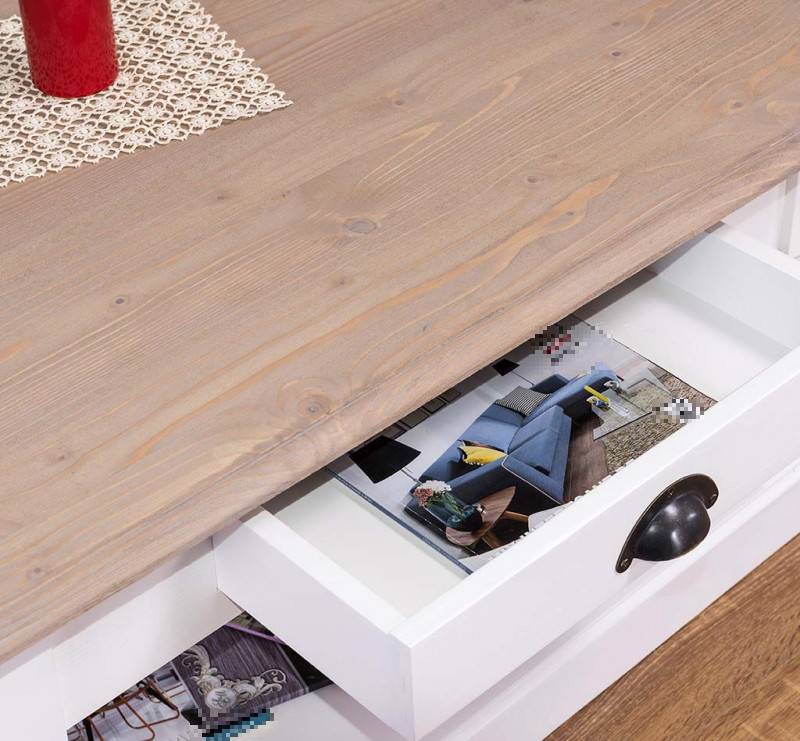 Die Schublade erfordert eine höhere Tischzarge als üblich. Der Tisch ist daher 2 Zentimeter höher als die anderen Couchtische.