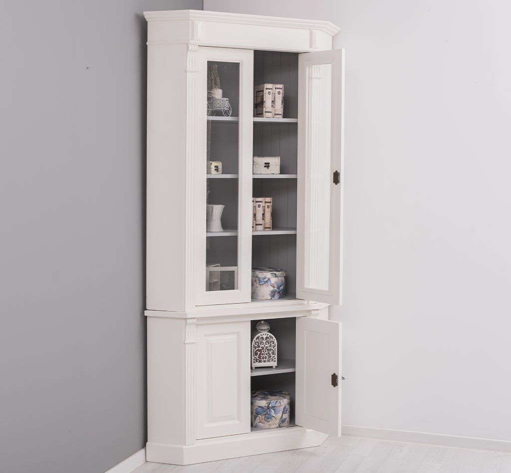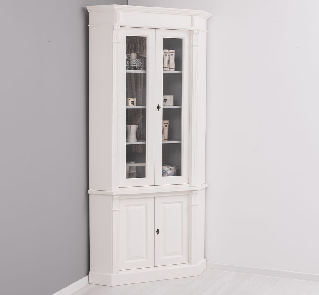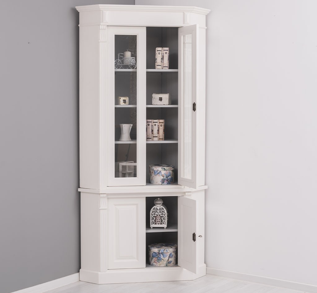 Im unteren Bereich bietet der Schrank hinter zwei klassischen Türen großzügigen Stauraum, der durch einen festen Einlegeboden sinnvoll gegliedert wird. Der darüberliegende Aufsatzschrank verfügt über zwei verglaste Türen, die den Blick auf das Innere freigeben und sich ideal zur Präsentation von Geschirr, Gläsern oder dekorativen Lieblingsstücken eignen. Daher nennen wir dieses besondere Möbel auch Eckvitrine.
