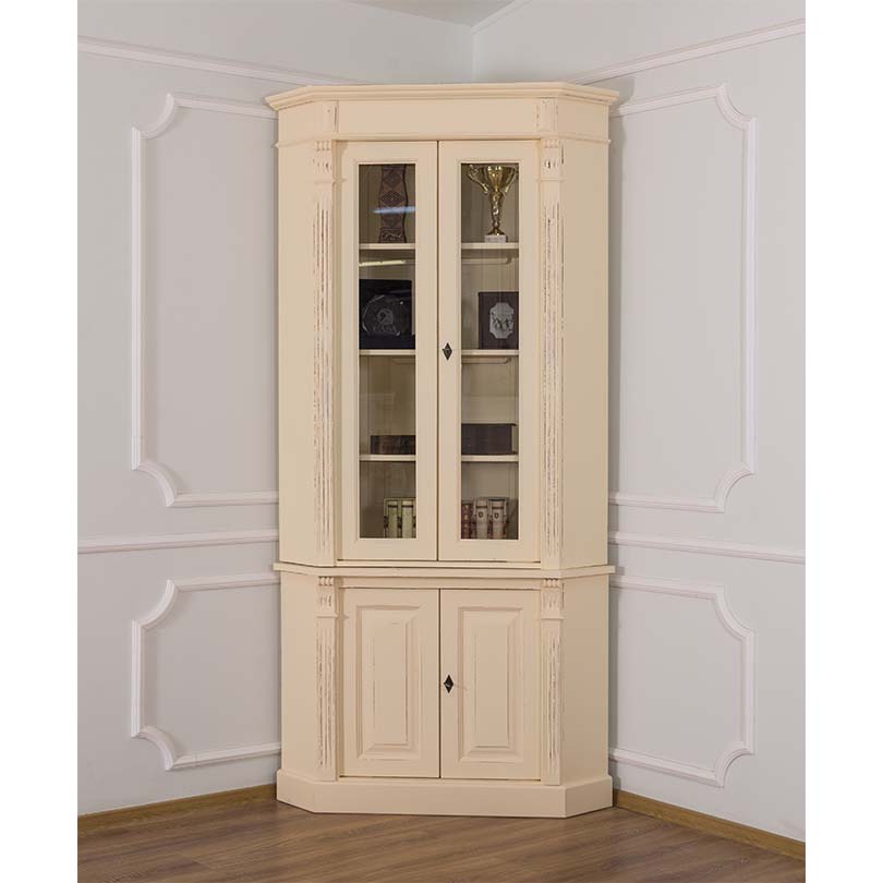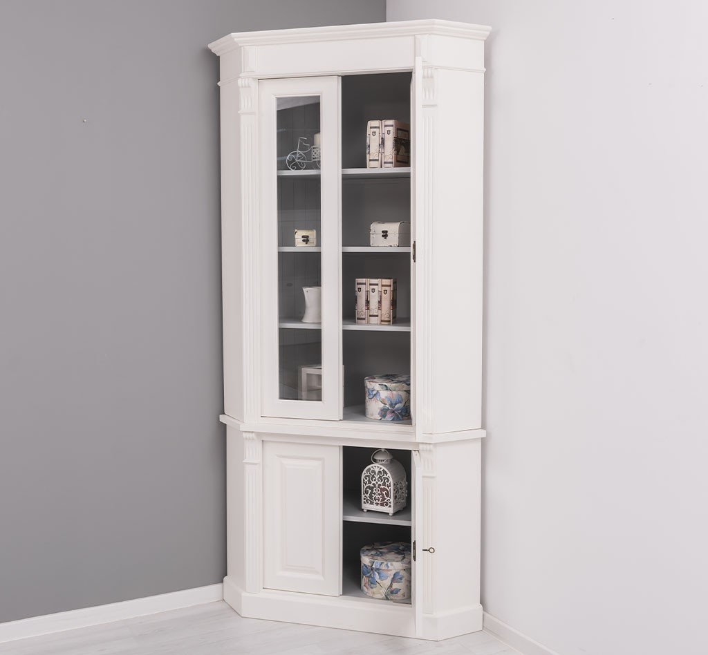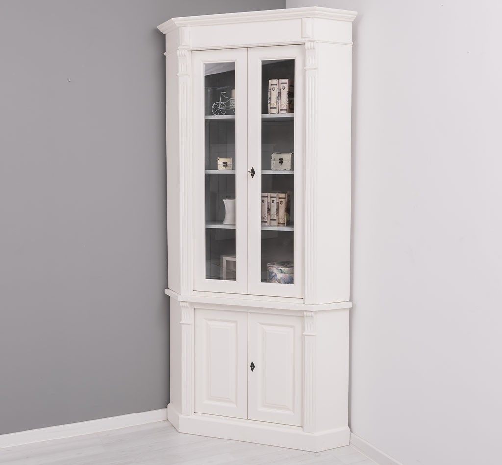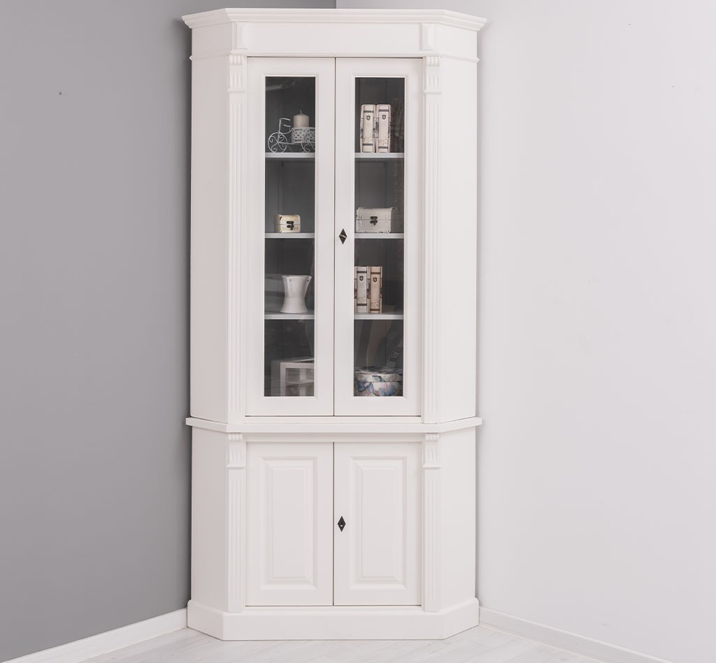 Im unteren Bereich bietet der Schrank hinter zwei klassischen Türen großzügigen Stauraum, der durch einen festen Einlegeboden sinnvoll gegliedert wird. Der darüberliegende Aufsatzschrank verfügt über zwei verglaste Türen, die den Blick auf das Innere freigeben und sich ideal zur Präsentation von Geschirr, Gläsern oder dekorativen Lieblingsstücken eignen. Daher nennen wir dieses besondere Möbel auch Eckvitrine.
