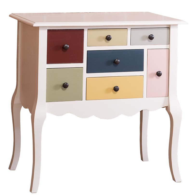 Die absolute Besonderheit dieser Kommode ist die Ausführung mit sieben kleinen Schubladen. Mit einer Multicolor-Lackierung der Schubladenfronten wird diese Kommode zum einzigartigen Hingucker. Es ist fast unmöglich, sich nicht sofort in diese verspielte Kommode zu verlieben. Die überstehende Deckplatte zeigt ein einfach abgesetztes Rundprofil. Die Deckplatte ist wahlweise aus Fichte oder aus massiver Eiche (stabverleimt) gefertigt.