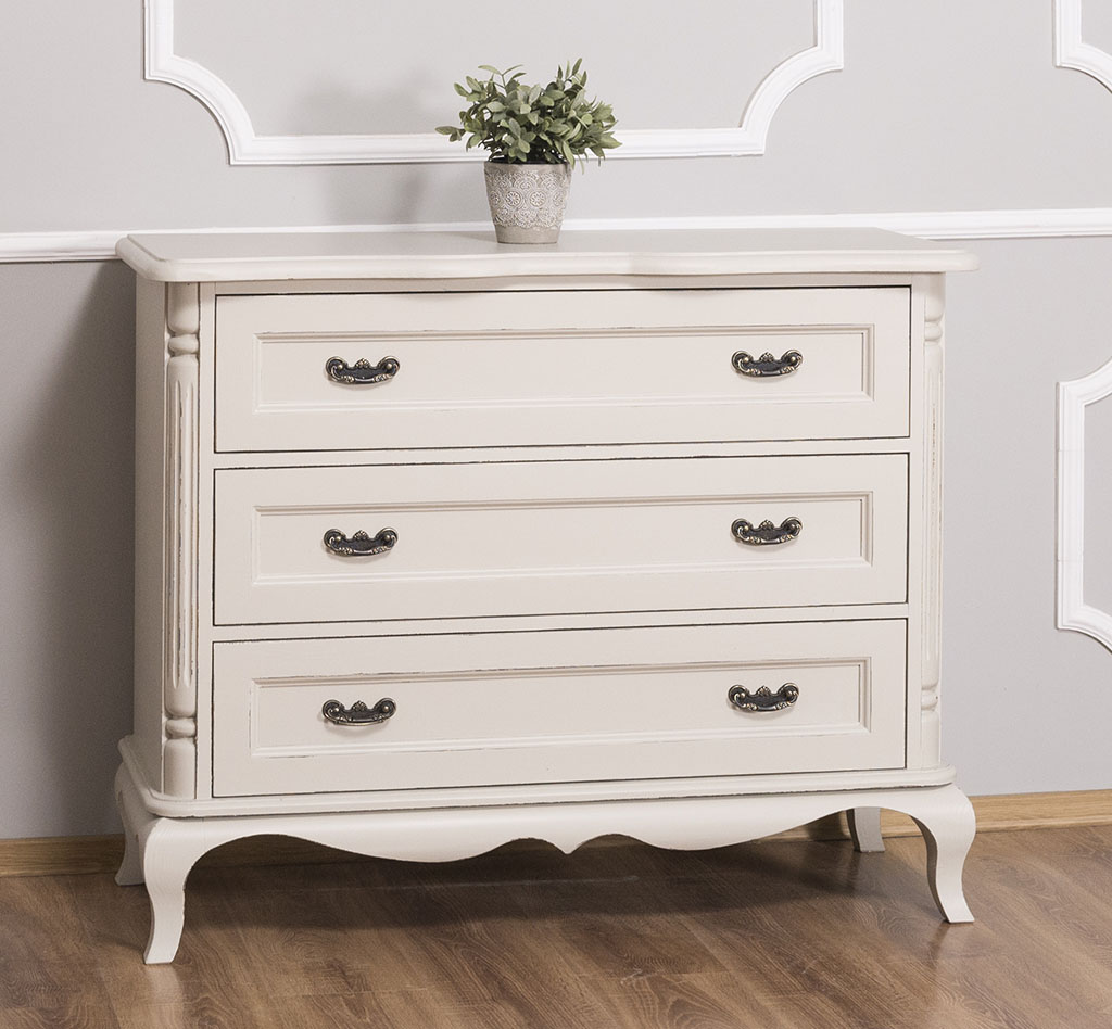 Diese Kommode ist die klassische Schubladen-Kommode mit den typischen Maßen 110 cm Breite, 48 cm Tiefe, 89 cm Höhe. Sie hat drei Schübe. Die Kommode ist auch von innen lackiert, ebenso die Schubladen. Die Schübe laufen auf Metall-Auszügen in „soft close“-Technik.