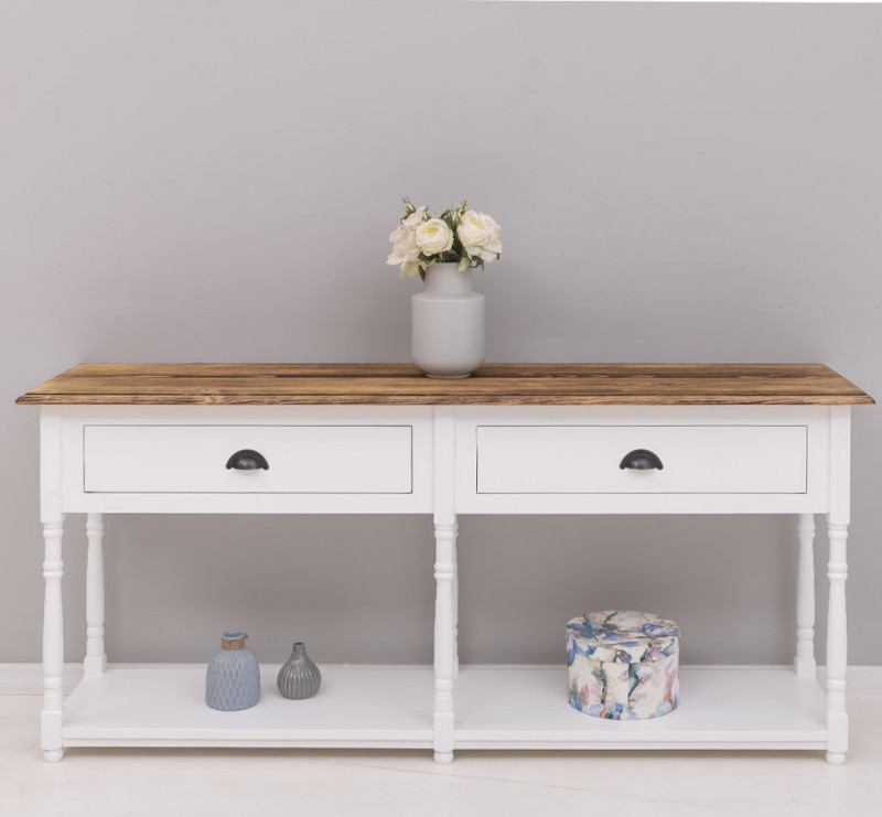 Breiter Konsoltisch mit 2 Schubladen und 1 Regalboden, aus 100% Massivholz