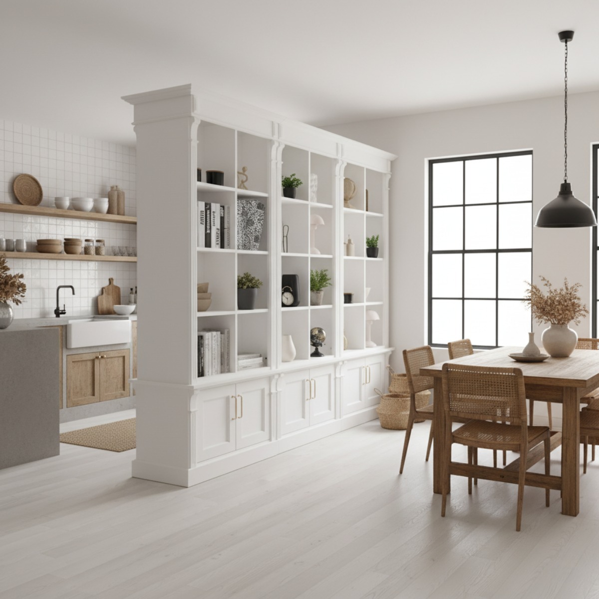 Der Raumteiler eignet sich ideal, um große Räume klar zu strukturieren und unterschiedliche Wohnbereiche harmonisch voneinander zu trennen – etwa den Wohnbereich vom Schlafbereich, die Küche vom Wohnzimmer oder das Wohnzimmer vom Home Office. So entstehen neue Zonen im Raum, ohne ihn zu verkleinern oder das offene Wohngefühl zu verlieren.