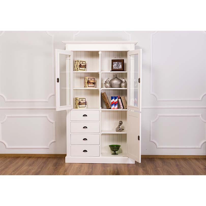 Einteiliger geschlossener Schrank oder Vitrinenschrank oder Büroschrank oder einfach Wohnzimmer-Schrank aus unserer Landhaus-Serie „Classic“. 100% Massivholz aus der EU. Im unteren Bereich hat er 3 Schübe neben einer abschließbaren Massivholz-Türe. Darüber befindet sich der Vitrinenbereich mit verglasten Schranktüren und mit 4 mitgelieferten Regalböden. Die Böden sind nicht durchgehend, sondern reichen über die halbe Breite. Es gibt also 3 Regalfächer. Die Regalböden sind natürlich ebenfalls aus Massivholz. Sie sind bei diesem Schrank nicht verstellbar und liegen auf fest montierten Auflageleisten.