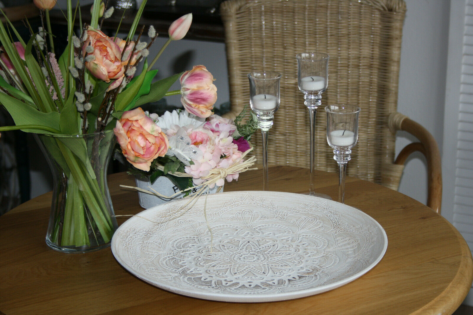 Verschönern Sie Ihren Tisch doch mal mit etwas Außergewöhnlichem. Dieser Nostalgische Deko Teller im klassischen Scandi Design ist perfekt dafür geeignet. Sein Holz ist weiß gekält und mit einem Mandala Muster versehen. Ein tolles Schmuckstück für jeden Tisch.