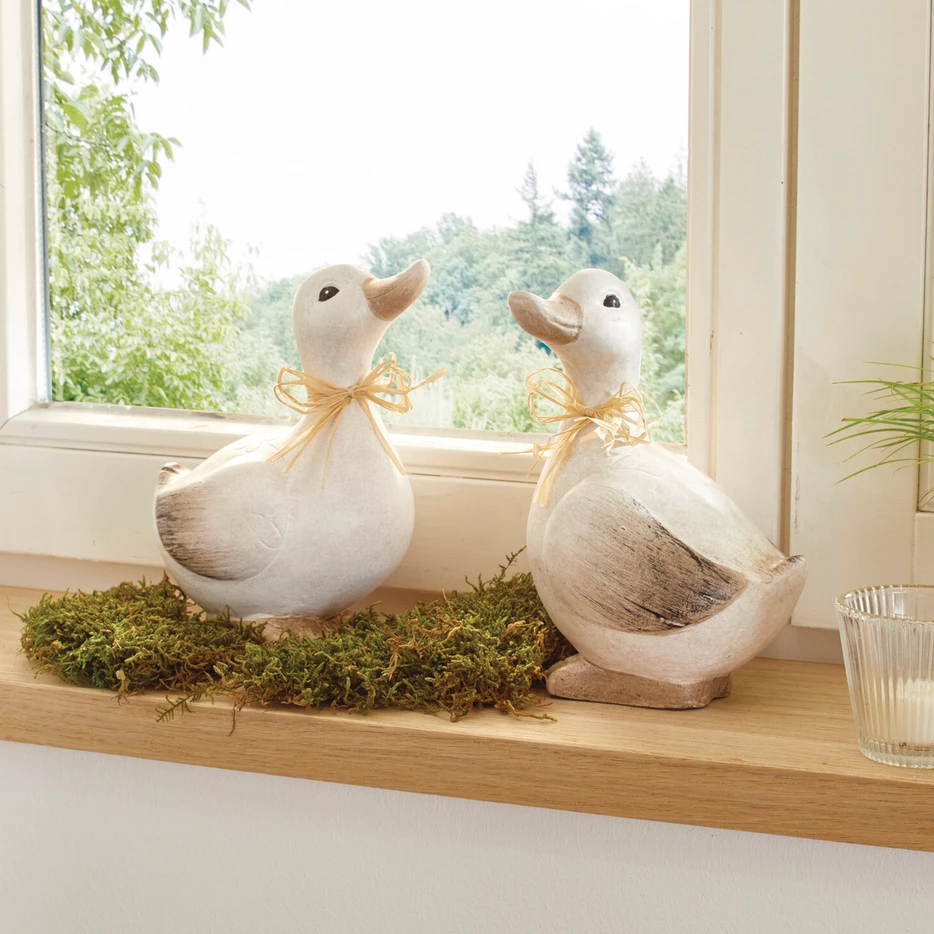 Die beiden Enten sind aus Terrakotta gefertigt. Sie sind nicht gerade filigran, aber das passt zu ihrem Charakter. Sie werden Ihnen nicht davonlaufen. Die Bemalung ihrer Flügel und des Entenschwanzes geben einen schönen Kontrast zum weißen Körper. Die Grundfarbe Braun, die auch den Entenschnabel ziert, passt hervorragend zu anderen Deko-Artikeln aus Natur-Terrakotta. Lassen Sie diese Deko-Ente bei sich einziehen!