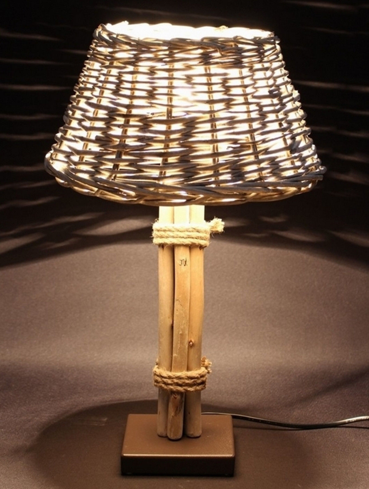 Hier haben wir eine weitere ganz besondere Tischleuchte für Sie ausgesucht. Sie ist mit Naturmaterialien gefertig: Der Lampenfuß ist mit Naturholz „Treibholz“ gestaltet. Mehrere Holzelemente sind mit Sisal zusammen gebunden. Der Lampenschirm besteht aus handgeflochtener Naturweide, die weiß gekälkt wurde.